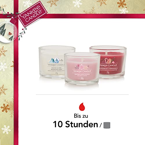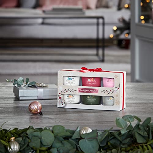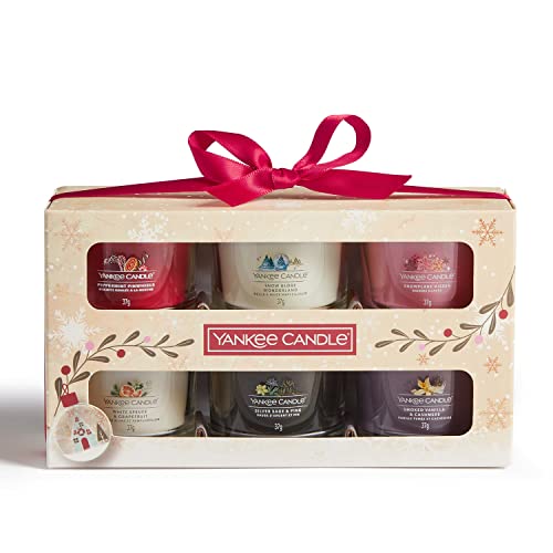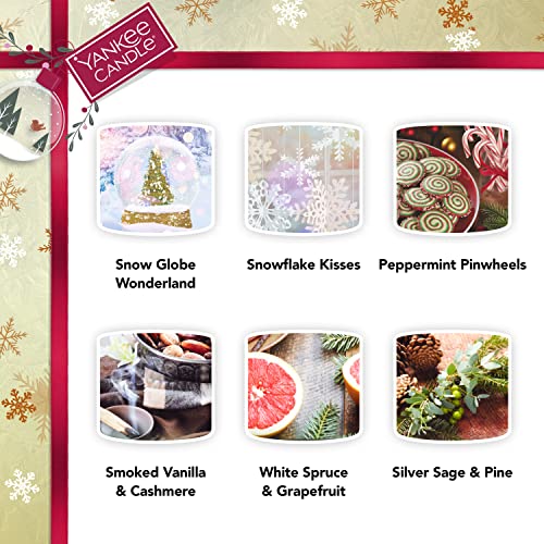 Dieses Geschenkset enthält 6 duftende gefüllte Votivkerzen, darunter Snow Globe Wonderland, Snowflake Kisses, Peppermint Pinwheels und mehr