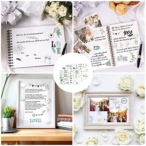 【Hochzeitsthema Aufkleber Set】 Das Paket umfasst 4 Bögen mit Hochzeitsbevorzugungsaufklebern, bestehend aus 179 Stück verschiedenen Mustern und Designs. Sie können sie auswählen und kombinieren, um Ihre eigenen Hochzeitsalben/Einladungen/Rahmen zu erstellen und Ihre Hochzeitsgästebücher zu dekorieren.
