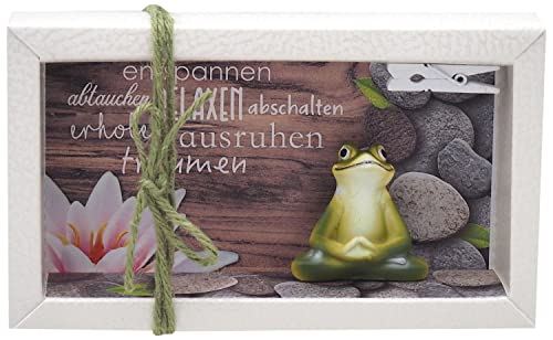 Inhalt: Ein kleiner Yoga Frosch/Dekofigur, eine Holzklammer, sowie ein auf Papier gedruckter Hintergrund.