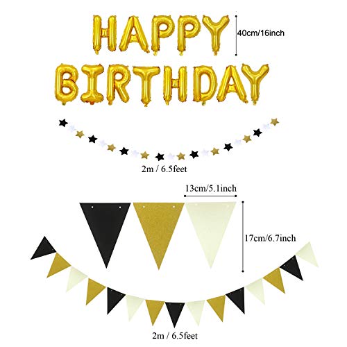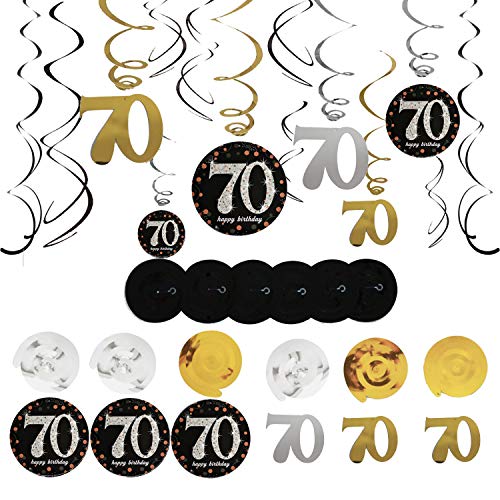 Tolles Vorteilspaket: Das Paket beinhaltet „HAPPY BIRTHDAY“ Folienballons (1 Satz), 70 Gold Zahlenluftballon (81cm) , Latexballons in Schwarz / Gold (20 Stück) , Sternförmige Ballons in Schwarz / Gold (4 Stück), 70. Geburtstag Swirl schwarz Partykette Girlande (12 Grafen), Happy Birthday Geburtstag Konfetti (15g).